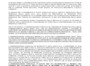 IN QUESTI GIORNI I CONTRIBUENTI DI CAROVIGNO SONO LETTERALMENTE INONDATI DI AVVISI DI PAGAMENTO RELATIVI ALLA TASSA RACCOLTA RIFIUTI SOLIDI URBANI PER LE ANNUALITÀ 2009- 2010-2011 E 2012 (A QUESTE SI AGGIUNGE IL CONGUAGLIO PER L'ANNO 2013) OLTRE AI PAGAMENTI PER LE LAMPADE VOTIVE RELATIVE, ANCHE QUESTE, AD ANNUALITÀ PRECEDENTI A QUELLA CORRENTE.