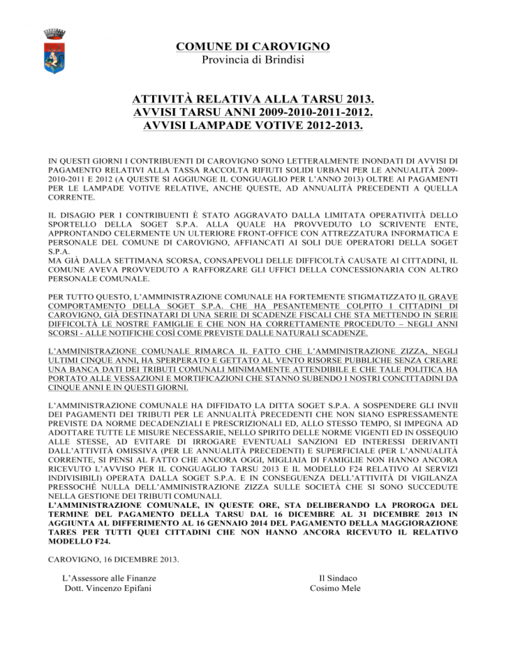 PER TUTTO QUESTO, L'AMMINISTRAZIONE COMUNALE HA FORTEMENTE STIGMATIZZATO IL GRAVE COMPORTAMENTO DELLA SOGET S.P.A. CHE HA PESANTEMENTE COLPITO I CITTADINI DI CAROVIGNO, GIÀ DESTINATARI DI UNA SERIE DI SCADENZE FISCALI CHE STA METTENDO IN SERIE DIFFICOLTÀ LE NOSTRE FAMIGLIE E CHE NON HA CORRETTAMENTE PROCEDUTO - NEGLI ANNI SCORSI - ALLE NOTIFICHE COSÌ COME PREVISTE DALLE NATURALI SCADENZE.